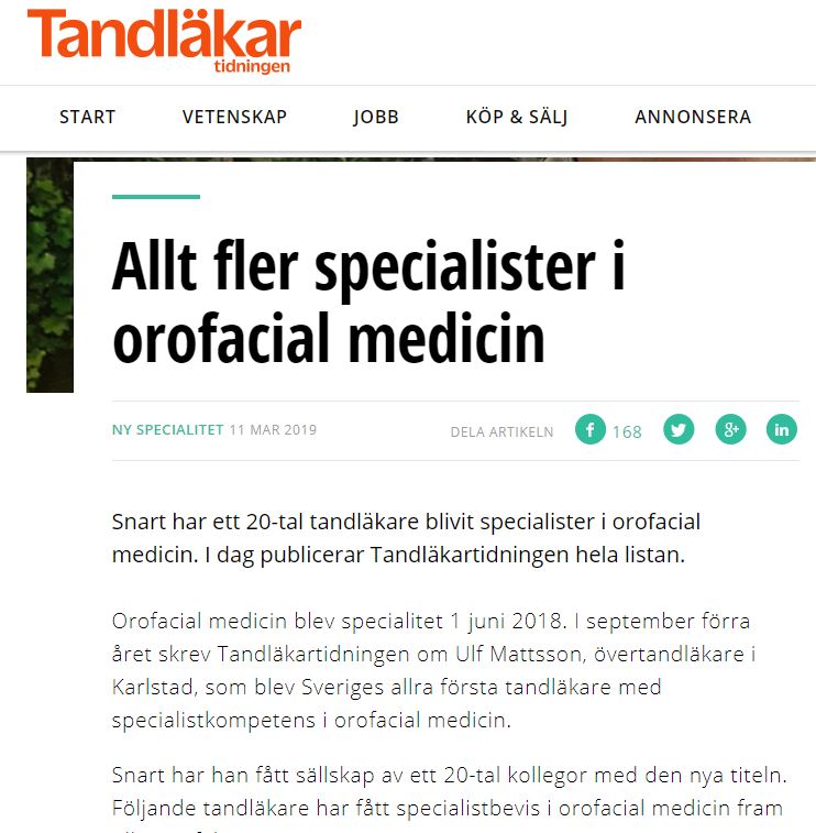 Enligt tandläkartidningen har ett 20-tal tandläkare nu blivit specialister i orofacial medicin. Klicka här för att läsa hela artikeln!